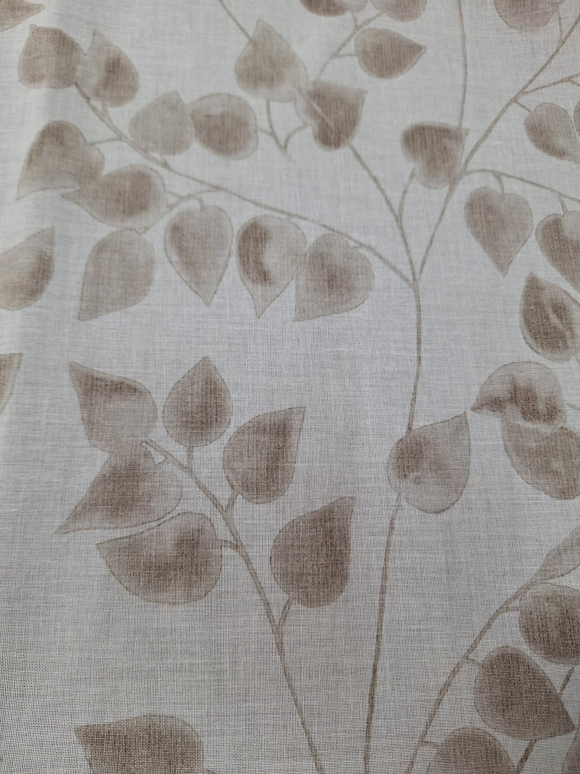 Visillo con estampado de hojitas en marrón. Tela fina. Precio por metro.